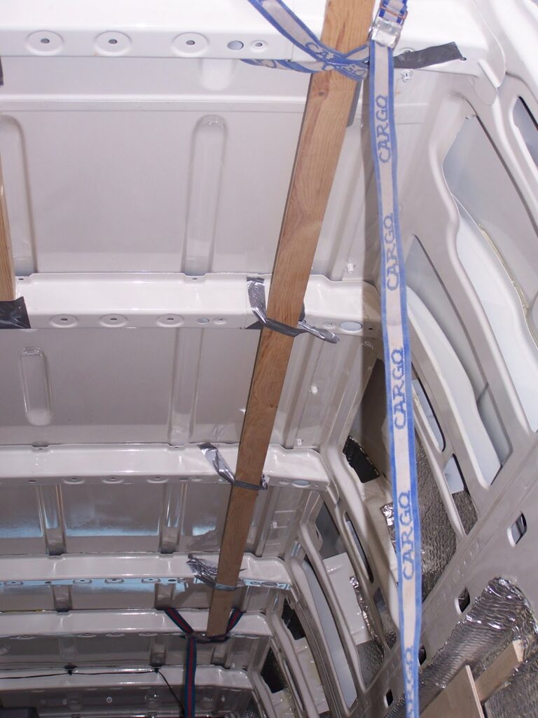 The afternoon was spent constructing the frame for the rooflight, and adhering subsidiary ceiling supports between the roof ribs. These were stuck in place using FC-40 PU adhesive and supported in place whilst with a combination of PSE timber, cargo straps and gaffer tape.