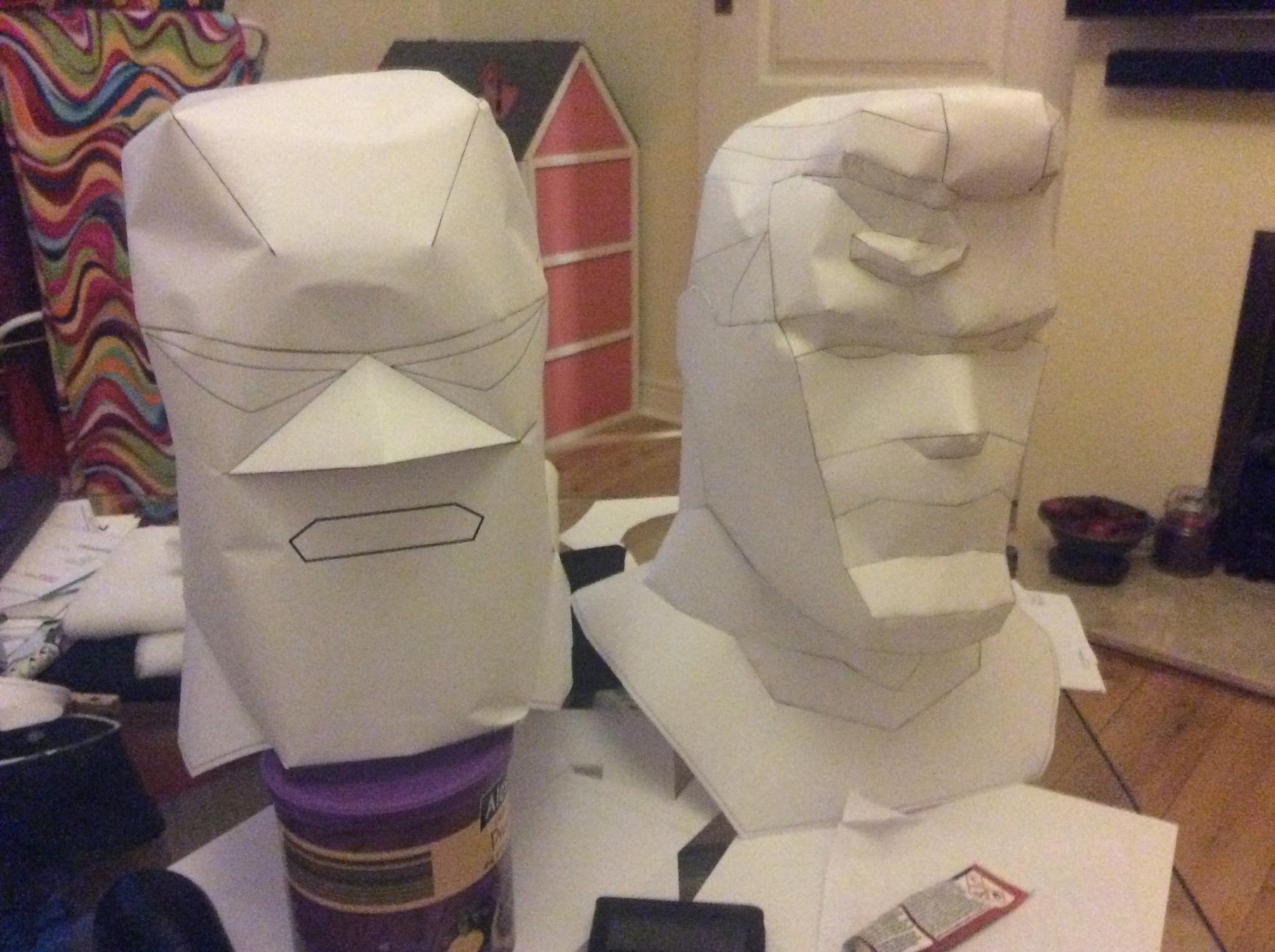 With the pattern complete in MS Visio, it was printed out at quarter scale and over a period of several hours (due to the curing time of the glue); the key uses for the maquette are firstly to assess the pattern for ease of assembly and secondly to search for innies that could become outies. Assembling the head I discovered two points that would need a 90o change of direction in the seam, but if I re-jig the layout of the polygonal pieces to have 32 pieces instead of 30 these corners disappear making assembly much more straight forward. The hunt for innies and outies involves working round the maquette search for points where the surface goes in but will pop out under the pressure of inflation, this head has a couple of points of risk but these are relatively easily handled by backing the areas with mesh in the final assembly.